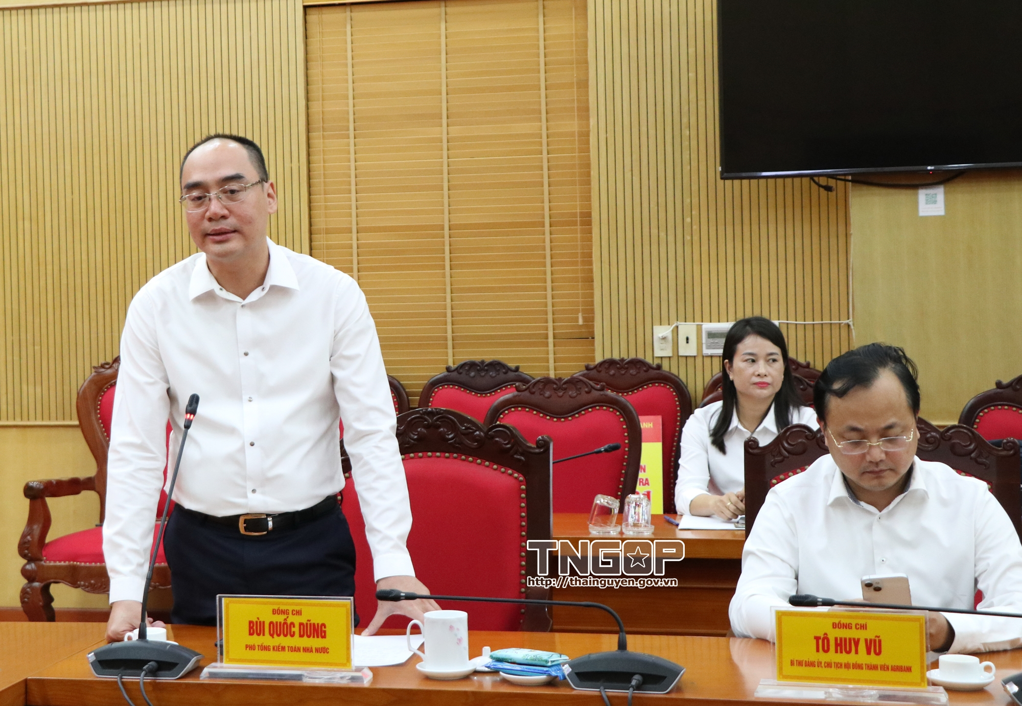 Thay mặt Đoàn công tác, đồng chí Bùi Quốc Dũng, Phó Tổng Kiểm toán Nhà nước chia sẻ với tỉnh Thái Nguyên về những thiệt hại phải gánh chịu do bão số 11 gây ra. Trước những thiệt hại thiên tai gây ra cho Thái Nguyên, Tổng Kiểm toán Nhà nước đã phối hợp cùng Ngân hàng Agribank và Tổng công ty Đầu tư và Kinh doanh vốn Nhà nước vận động, ủng hộ tỉnh Thái Nguyên 2 tỷ đồng, đồng thời hỗ trợ cho lĩnh vực y tế và giáo dục từ nguồn xã hội hóa với số tiền 5 tỷ đồng. Đồng chí Bùi Quốc Dũng bày tỏ mong muốn số kinh phí hỗ trợ sớm được giải ngân kịp thời, giúp người dân vùng bị ảnh hưởng ổn định đời sống, khôi phục sản xuất. Đồng chí tin tưởng, với tinh thần đoàn kết và nỗ lực của toàn hệ thống chính trị, tỉnh Thái Nguyên sẽ sớm vượt qua khó khăn, phục hồi phát triển kinh tế - xã hội, tiếp tục khẳng định vai trò trung tâm vùng trung du và miền núi phía Bắc.