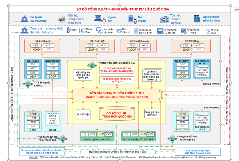 Sơ đồ tổng quát khung kiến trúc dữ liệu quốc gia bao gồm các thành phần: Người sử dụng (người thụ hưởng) bao gồm người dân, cán bộ, công chức, viên chức, du khách; các tổ chức, doanh nghiệp, các cơ quan, tổ chức khác; các cơ quan xã, phường. Các kênh giao tiếp bao gồm phương thức giao tiếp tại các Trung tâm phục vụ hành chính công, Bộ phận một cửa và các kênh số như kiosk, điện thoại, tin nhắn, thư điện tử, ứng dụng trên điện thoại thông minh, ứng dụng trên máy tính để bàn (Desktop), ứng dụng web hoặc các thiết bị khác. Các thành phần dữ liệu bao gồm: cơ sở dữ liệu (CSDL) tổng hợp quốc gia nằm ở trung tâm; các cơ sở dữ liệu quốc gia, cơ sở dữ liệu dùng chung và cơ sở dữ liệu chuyên ngành, hệ thống thông tin (HTTT) của các cơ quan là các hệ thống vệ tinh để cung cấp dữ liệu cho Cơ sở dữ liệu tổng hợp quốc gia. Nền tảng chia sẻ, điều phối dữ liệu (tên tiếng Anh là National Data Orchestration Platform, viết tắt là NDOP) - tất cả hoạt động kết nối, chia sẻ dữ liệu bắt buộc đều phải thực hiện thông qua Nền tảng chia sẻ, điều phối dữ liệu để thực hiện việc giám sát, truy vết và đánh giá hiệu quả. Các hệ thống thông tin quốc gia tiêu biểu phục vụ quản trị, quản lý dữ liệu quốc gia bao gồm: hệ thống giám sát an toàn, an ninh mạng (SOC - Security Operation Center) của Trung tâm dữ liệu quốc gia (TTDLQG); hệ thống Quản trị dữ liệu Quốc gia; hệ thống Từ điển dữ liệu dùng chung; hệ thống Cổng dữ liệu Quốc gia; sàn dữ liệu của TTDLQG. Các hệ thống thông tin quốc gia tiêu biểu khác kết nối với Nền tảng Chia sẻ, điều phối dữ liệu như Cổng Dịch vụ công Quốc gia; Nền tảng VNeID/Nền tảng định danh và xác thực điện tử… Các cơ quan ở Trung ương kết nối với Nền tảng NDOP bao gồm các bộ, cơ quan ngang bộ, cơ quan thuộc Chính phủ, cơ quan trung ương của tổ chức chính trị, Viện Kiểm sát nhân dân tối cao, Tòa án nhân dân tối cao, Kiểm toán Nhà nước, Văn phòng Chủ tịch nước, Văn phòng Quốc hội, Văn Phòng Trung ương Đảng, cơ quan Trung ương thuộc Mặt trận Tổ quốc Việt Nam. Các cơ quan địa phương kết nối với Nền tảng NDOP bao gồm UBND và HĐND các tỉnh, thành phố; các cơ quan Đảng ở địa phương, các tổ chức chính trị - xã hội; các doanh nghiệp nhà nước và các tổ chức, doanh nghiệp khác cũng được kết nối vào Nền tảng NDOP. Cơ quan đại diện Việt Nam ở nước ngoài kết nối tới Nền tảng NDOP để trao đổi dữ liệu phục vụ thương mại, hợp tác quốc tế. Hạ tầng truyền dẫn bao gồm hạ tầng mạng truyền dẫn Internet toàn cầu; hạ tầng mạng truyền số liệu chuyên dùng bảo đảm liên thông, đồng bộ, bí mật trong hoạt động của Đảng, Nhà nước và các cơ quan trong hệ thống chính trị. Hạ tầng Trung tâm dữ liệu bao gồm Trung tâm dữ liệu quốc gia, các trung tâm dữ liệu của bộ, ngành, khối cơ quan; các trung tâm dữ liệu của tỉnh/thành phố; các trung tâm dữ liệu của doanh nghiệp. Hạ tầng An toàn thông tin mạng, an ninh mạng bao gồm các hạ tầng và hệ thống bảo mật, kết nối với Trung tâm giám sát an toàn không gian mạng (SOC) của Trung tâm dữ liệu quốc gia và các SOC của các cơ quan trong hệ thống chính trị, bảo đảm an toàn cho toàn bộ hạ tầng công nghệ thông tin của quốc gia từ trung ương đến địa phương.