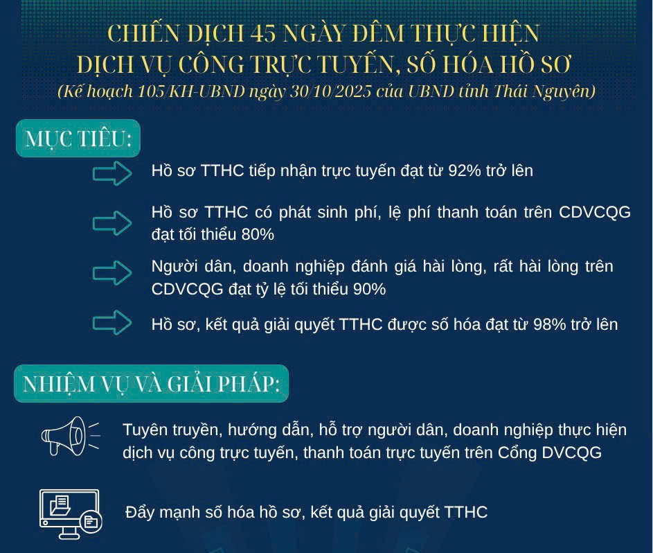 Ngày 30/10/2025, UBND tỉnh ban hành Kế hoạch đợt cao điểm 45 ngày đêm thực hiện dịch vụ công trực tuyến, số hóa hồ sơ trên địa bàn tỉnh Thái Nguyên (Kế hoạch số 105/KH-UBND)