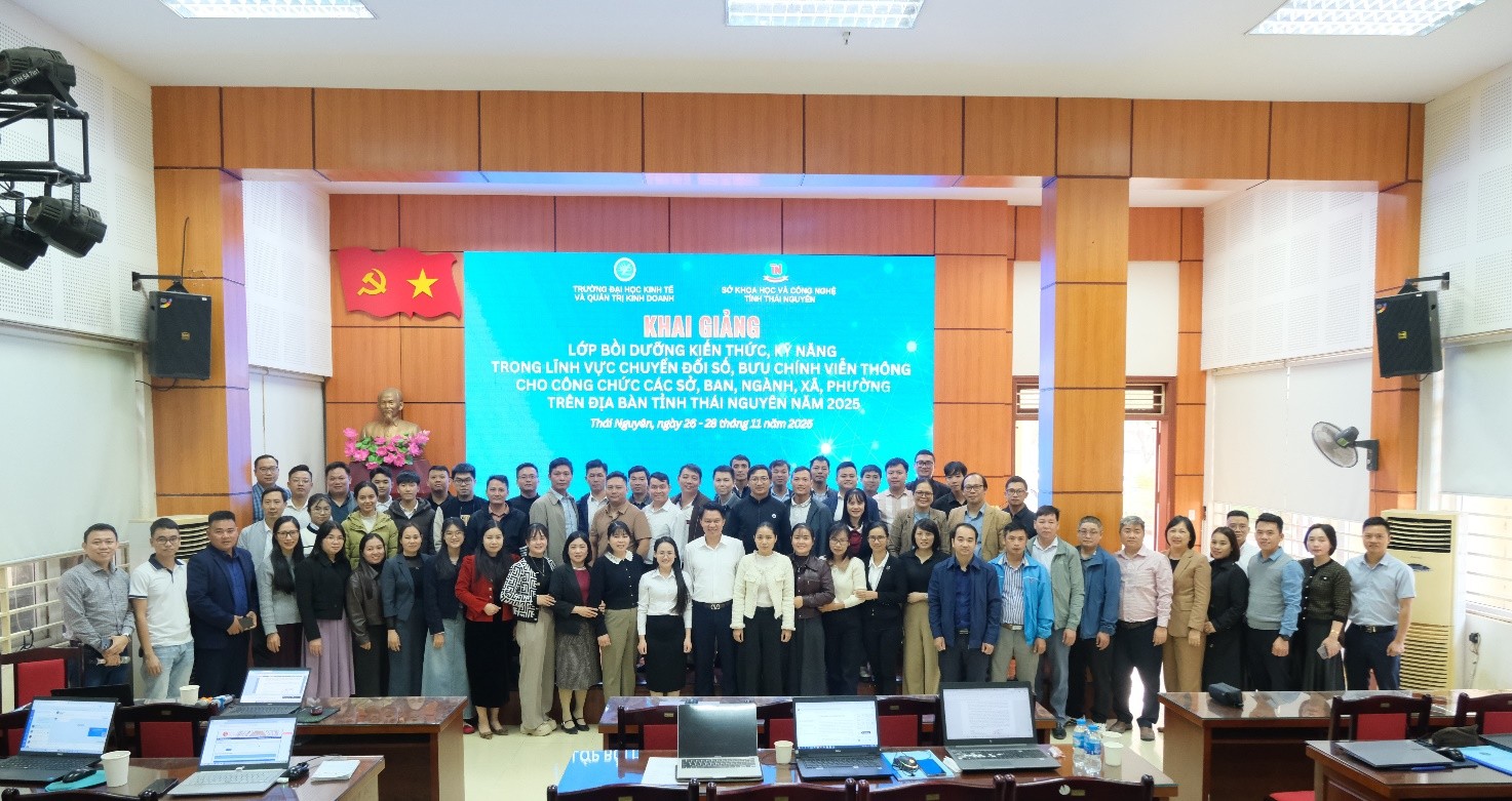 Trong các ngày 26 - 28/11/2025 và 01 - 03/12/2025 tại Phường Phan Đình Phùng và Phường Đức Xuân tỉnh Thái Nguyên, Sở Khoa học và Công nghệ tỉnh Thái Nguyên phối hợp với Trường Đại học Kinh tế và Quản trị Kinh doanh tổ chức 02 lớp bồi dưỡng kiến thức, kỹ năng về chuyển đổi số; bưu chính, viễn thông với sự tham gia của 190 công chức công tác tại các sở, ban, ngành và UBND các xã, phường trên địa bàn tỉnh.
