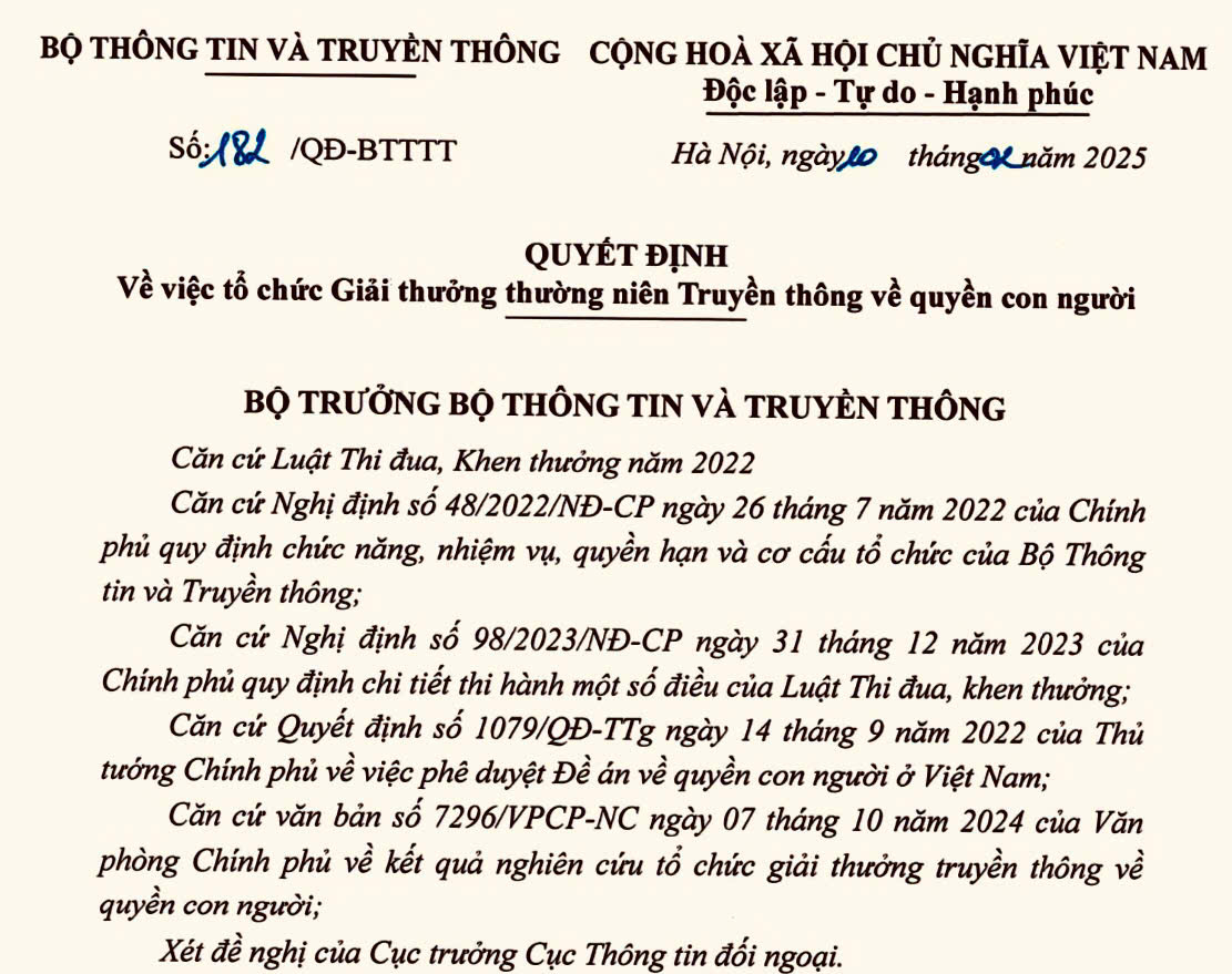 Bộ trưởng Bộ Thông tin và Truyền thông vừa ra quyết định tổ chức Giải thưởng thường niên Truyền thông về quyền con người nhằm truyền thông sâu rộng về các nỗ lực và thành tựu của Việt Nam trong công tác bảo vệ và phát huy quyền con người. Đây là giải thưởng do Bộ Thông tin và Truyền thông chủ trì, phối hợp với các bộ, ngành liên quan phát động và tổ chức trao giải hàng năm.