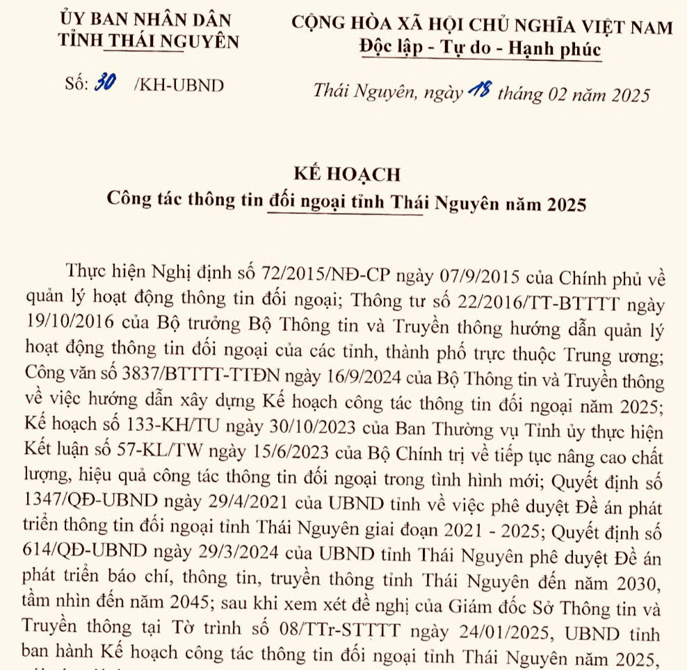 Kế hoạch công tác thông tin đối ngoại tỉnh Thái Nguyên năm 2025